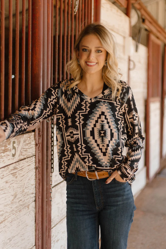 Elevate your look with the Ashwood Trail Top! Featuring a sleek black base and a striking Aztec pattern in gray, cream, and black, this long-sleeve design offers both bold style and versatile comfort. Perfect for layering or wearing on its own, this top has a flattering curved bottom and vneck that we all love.