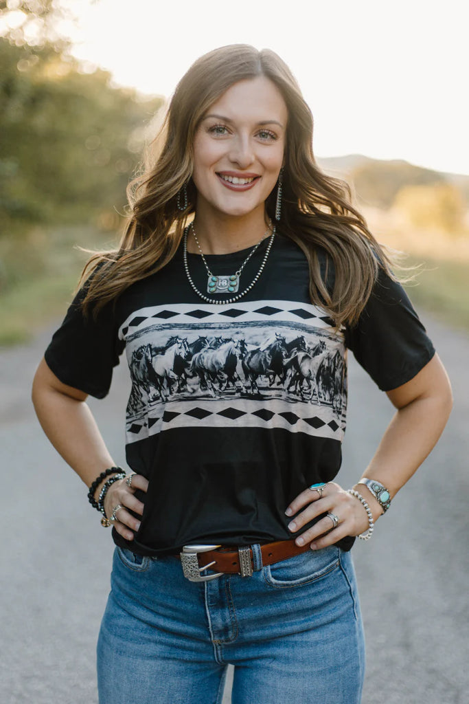 The Remuda Rush Top captures the spirit of the wild with an elegant portrayal of a galloping herd, enhanced by delicate buck stitching. Its deep black fabric adds a sleek backdrop making it a statement for those who value authentic western style. This to captures the true spirit of any horse lover.